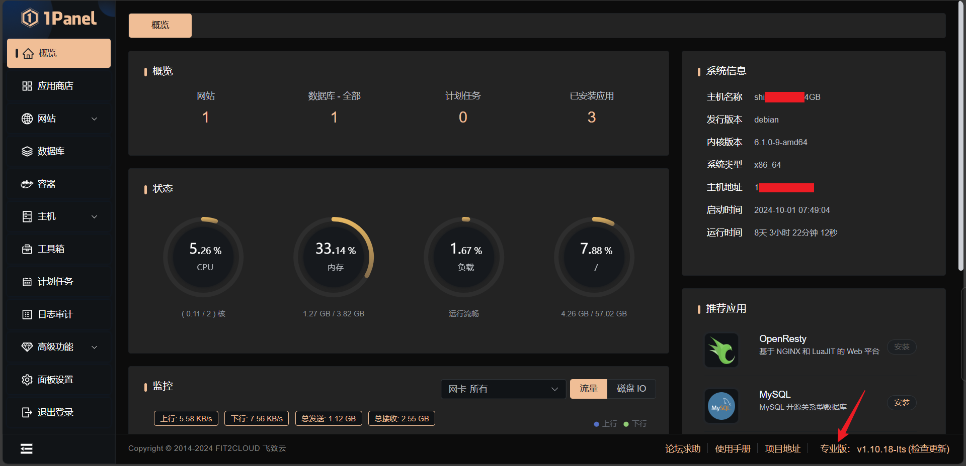 上面就是1Panel的后台界面,善于观察的小伙伴可能会注意到我使用的是黑金色的专业版,和你们的界面有些不同。这是因为我购买了专业版,不过不用担心,免费版同样好用,你也可以轻松一键搭建自己的网站和一些有趣的应用。